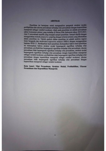 Penelitian ini bertujuan untuk menganalisis pengaruh struktur modal, profitabilitas dan ukuran perusahaan terhadap nilai perusahaan dengan kepemilikan manajerial sebagai variabel moderasi. objek pada penelitian ini adalah perusahaan sektor konsumen primer yang terdaftar di Bursa Efek Indonesia tahun 2019-2023. Ada 33 perusahaan terpilih yang menjadi sampel penelitian. Sampel dipilih dengan menggunakan metode purposive sampling dengan kriteria tertentu yang dibutuhkan dalam penelitian ini. Teknik analisis dalam penelitian ini adalah analisis regresi linier berganda dan moderated regression analysis (MRA) dengan menggunakan bantuan SPSS 21. Berdasarkan hasil penelitian disimpulkan bahwa hasil penelitian ini menunjukan bahwa struktur modal berpengaruh signifikan terhadap nilai perusahaan, profitabilitas berpengaruh signifikan terhadap nilai perusahaan, ukuran perusahaan tidak berpengaruh signifikan terhadap nilai perusahaan, struktur modal berpengaruh signifikan terhadap nilai perusahaan dengan kepemilikan manajerial sebagai variabel moderasi, profitabilitas tidak berpengaruh signifikan terhadap nilai perusahaan dengan kepemilikan manajerial sebagai variabel moderasi, ukuran perusahaan tidak berpengaruh signifikan terhadap nilai perusahaan dengan kepemilikan manajerial sebagai variabel moderasi. Kata kunci: Nilai Perusahaan, Struktur Modal, Profitabilitas, Ukuran Perusahaan dan Kepemilikan Manajerial.
