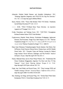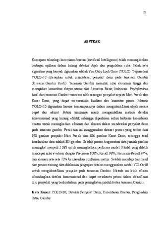 Kemajuan teknologi kecerdasan buatan (Artificial Intelligence) telah memungkinkan berbagai aplikasi dalam bidang deteksi objek dan pengolahan citra. Salah satu algoritma yang banyak digunakan adalah You Only Look Once (YOLO). Tujuan dari YOLOv10 diterapkan untuk mendeteksi penyakit daun pada tanaman Gambir (Uncaria Gambir Roxb). Tanaman Gambir memiliki nilai ekonomis tinggi dan merupakan komoditas ekspor utama dari Sumatera Barat, Indonesia. Produktivitas hasil dari tanaman Gambir terancam oleh serangan penyakit seperti Mati Pucuk dan Karat Daun, yang dapat menurunkan kualitas dan kuantitas panen. Metode YOLOv10 digunakan karena kemampuannya dalam mengidentifikasi objek secara cepat dan akurat. Petani umumnya masih mengandalkan metode deteksi konvensional yang kurang efektif, sehingga diperlukan solusi berbasis kecerdasan buatan untuk meningkatkan efisiensi dan akurasi dalam mendeteksi penyakit daun pada tanaman gambir. Penelitian ini menggunakan dataset primer yang terdiri dari 198 gambar penyakit Mati Pucuk dan 186 gambar Karat Daun, sehingga total keseluruhan data adalah 384 gambar. Setelah proses Augmentasi data jumlah gambar meningkat menjadi 2.688 untuk meningkatkan performa model. Model yang dilatih mencapai nilai evaluasi dengan Precision 100%, Recall 98%, Precision-Recall 94%, dan akurasi rata-rata 73% berdasarkan confusion matrix. Setelah mendapatkan hasil dari proses training data dilakukan pengujian deteksi menggunakan model YOLOv10 untuk mengidentifikasi penyakit pada tanaman Gambir. Metode ini lebih efisien dibandingkan deteksi konvensional dan dapat membantu petani dalam identifikasi dini penyakit, yang berkontribusi pada peningkatan produktivitas tanaman Gambir.