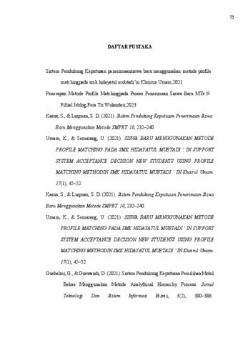 Wedo, Mhd (2025) SISTEM PENDUKUNG KEPUTUSAN MENGGUNAKAN METODE PROFILE MATCHING DALAM PENERIMAAN SISWA BARU BERBASIS WEB (STUDI KASUS DI SMPN 1 KERINCI). Masters thesis, Universitas Putra Indonesia YPTK.
