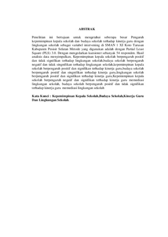 Penelitian ini bertujuan untuk mengetahui seberapa besar Pengaruh kepemimpinan kepala sekolah dan budaya sekolah terhadap kinerja guru dengan lingkungan sekolah sebagai variabel intervening di SMAN 1 XI Koto Tarusan Kabupaten Pesisir Selatan Metode yang digunakan adalah dengan Partial Least Square (PLS) 3.0. Dengan mengedarkan kuesioner sebanyak 54 responden. Hasil analisis data menyimpulkan, Kepemimpinan kepala sekolah berpengaruh positif dan tidak signifikan terhadap lingkungan sekolah,budaya sekolah berpengaruh negatif dan tidak singnifikan terhadap lingkungan sekolah,kepemimpinan kepala sekolah berpengaruh positif dan signifikan terhadap kinerja guru,budaya sekolah berpengaruh positif dan singnifikan terhadap kinerja guru,lingkungan sekolah berpengaruh positif dan signifikan terhadap kinerja guru,Kepemimpinan kepala sekolah berpengaruh negatif dan signifikan terhadap kinerja guru memediasi lingkungan sekolah, budaya sekolah berpengaruh positif dan tidak signifikan terhadap kinerja guru memediasi lingkungan sekolah Kata Kunci : Kepemimpinan Kepala Sekolah,Budaya Sekolah,Kinerja Guru Dan Lingkungan Sekolah.