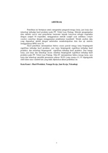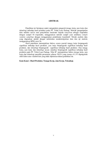 Penelitian ini bertujuan untuk mengetahui pengaruh tenaga kerja, jam kerja dan teknologi terhadap hasil produksi pada PT. Teluk Luas Padang. Metode pengumpulan data melalui survei atau penyebaran kuesioner kepada karyawan sebagai responden dengan sampel 56 responden, menggunakan metode sampel acak sedehana (simple random sampling) dengan menggunakan pendekatan kuantitatif. Teknik analisis data yang digunakan adalah dengan melakukan mendeskripsikan data dan uji statistic menggunakan SPSS versi 26. Hasil penelitian menunjukkan bahwa secara parsial tenaga kerja berpengaruh signifikan terhadap hasil produksi, jam kerja berpengaruh signifikan terhadap hasil produksi, dan teknologi berpengaruh signifikan terhadap hasil produksi. Dan tenaga kerja, jam kerja dan teknologi secara simultan berpengaruh signifikan terhadap hasil produksi pada PT. Teluk Luas Padang. Nilai R2 menunjukkan bahwa tenaga kerja, jam kerja dan teknologi memiliki persentase sebesar 58,9% yang sisanya 41,1% dipengaruhi oleh faktor atau variabel lain yang tidak dijelaskan dalam penelitian ini. Kata Kunci : Hasil Produksi, Tenaga Kerja, Jam Kerja, Teknologi.