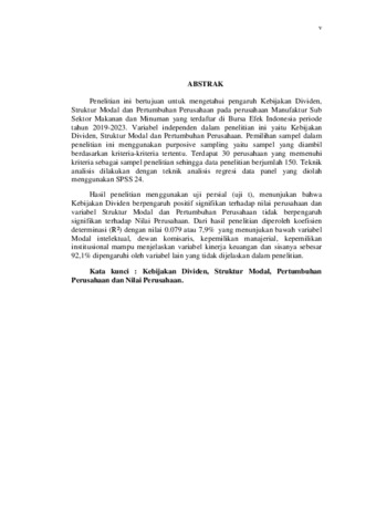 Penelitian ini bertujuan untuk mengetahui pengaruh Kebijakan Dividen, Struktur Modal dan Pertumbuhan Perusahaan pada perusahaan Manufaktur Sub Sektor Makanan dan Minuman yang terdaftar di Bursa Efek Indonesia periode tahun 2019-2023. Variabel independen dalam penelitian ini yaitu Kebijakan Dividen, Struktur Modal dan Pertumbuhan Perusahaan. Pemilihan sampel dalam penelitian ini menggunakan purposive sampling yaitu sampel yang diambil berdasarkan kriteria-kriteria tertentu. Terdapat 30 perusahaan yang memenuhi kriteria sebagai sampel penelitian sehingga data penelitian berjumlah 150. Teknik analisis dilakukan dengan teknik analisis regresi data panel yang diolah menggunakan SPSS 24. Hasil penelitian menggunakan uji persial (uji t), menunjukan bahwa Kebijakan Dividen berpengaruh positif signifikan terhadap nilai perusahaan dan variabel Struktur Modal dan Pertumbuhan Perusahaan tidak berpengaruh signifikan terhadap Nilai Perusahaan. Dari hasil penelitian diperoleh koefisien determinasi (R2) dengan nilai 0.079 atau 7,9% yang menunjukan bawah variabel Modal intelektual, dewan komisaris, kepemilikan manajerial, kepemilikan institusional mampu menjelaskan variabel kinerja keuangan dan sisanya sebesar 92,1% dipengaruhi oleh variabel lain yang tidak dijelaskan dalam penelitian. Kata kunci : Kebijakan Dividen, Struktur Modal, Pertumbuhan Perusahaan dan Nilai Perusahaan.