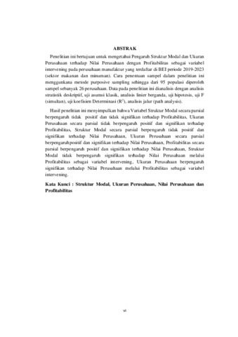 Penelitian ini bertujuan untuk mengetahui Pengaruh Struktur Modal dan Ukuran Perusahaan terhadap Nilai Perusahaan dengan Profitabilitas sebagai variabel intervening pada perusahaan manufaktur yang terdaftar di BEI periode 2019-2023 (sektor makanan dan minuman). Cara penentuan sampel dalam penelitian ini menggunkana metode purposive sampling sehingga dari 95 populasi diperoleh sampel sebanyak 26 perusahaan. Data pada penelitian ini dianalisis dengan analisis stratistik deskriptif, uji asumsi klasik, analisis linier berganda, uji hipotesis, uji F (simultan), uji koefisien Determinasi (R2 ), analisis jalur (path analysis). Hasil penelitian ini menyimpulkan bahwa Variabel Struktur Modal secara parsial berpengaruh tidak positif dan tidak signifikan terhadap Profitabilitas, Ukuran Perusahaan secara parsial tidak berpengaruh positif dan signifikan terhadap Profitabilitas, Struktur Modal secara parsial berpengaruh tidak positif dan signifikan terhadap Nilai Perusahaan, Ukuran Perusahaan secara parsial berpengaruhpositif dan signifikan terhadap Nilai Perusahaan, Profitabilitas secara parsial berpengaruh positif dan signifikan terhadap Nilai Perusahaan, Struktur Modal tidak berpengaruh signifikan terhadap Nilai Perusahaan melalui Profitabilitas sebagai variabel intervening, Ukuran Perusahaan berpengaruh signifikan terhadap Nilai Perusahaan melalui Profitabilitas sebagai variabel intervening. Kata Kunci : Struktur Modal, Ukuran Perusahaan, Nilai Perusahaan dan Profitabilitas