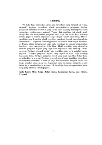 PT Suka Fajar merupakan salah satu perusahaan yang bergerak di bidang otomatif, kegiatan perusahaan adalah mengusahakan pelayanan didalam pengadaan kendaraan bermotor yang secara tidak langsung berpengaruh dalam menunjang pembangunan nasional. Tujuan dari penelitian ini adalah untuk mengetahui dan menganalisis pengaruh stres kerja dan beban kerja terhadap kinerja pegawai melalui kepuasaan kerja sebagai variabel intervening. Metode penelitian yang digunakan adalah penelitian kuantitatif. Jumlah sampel penelitian ini sebanyak 57 responden dan menggunakan alat analisis SEM dengan SmartPLS 3. Dalam teknik pengumpulan data pada penelitian ini dengan menyebarkan kuesioner yang menggunakan skala likert. Hasil penelitian yang didapatkan terdapat pengaruh negatif yang signifikan kepuasaan kerja terhadap kinerja pegawai. Terdapat pengaruh positif yang signifikan stres kerja terhadap kinerja pegawai. Terdapat pengaruh negatif yang signifikan stres kerja terhadap kepuasaan kerja. Terdapat pengaruh positif yang tidak signifikan beban kerja terhadap kinerja pegawai. Terdapat pengaruh positif yang signifikan beban kerja terhadap kepuasaan kerja. Kepuasaan kerja tidak memediasi pengaruh positif stres kerja terhadap kinerja pegawai. Kepuasaan kerja memediasi pengaruh negatif beban kerja terhadap kinerja pegawai. PT Suka Fajar harus memperhatikan beban kerja yang diberikan kepada pegawai. Kata Kunci: Stres Kerja, Beban Kerja, Kepuasaan Kerja, dan Kinerja Pegawa