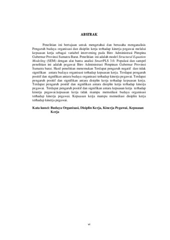 Penelitian ini bertujuan untuk mengetahui dan berusaha menganalisis Pengaruh budaya organisasi dan disiplin kerja terhadap kinerja pegawai melalui kepuasan kerja sebagai variabel intervening pada Biro Administrasi Pimpina Gubernur Provinsi Sumatra Barat. Penelitian ini adalah model Structural Equation Modeling (SEM) dengan alat bantu analisi SmartPLS 3.0. Populasi dan sampel penelitian ini adalah pegawai Biro Administrasi Pimpinan Gubernur Provinsi Sumatra barat. Hasil penelitian menemukan Terdapat pengaruh negatif dan tidak signifikan antara budaya organisasi terhadap kepuasan kerja. Terdapat pengaruh positif dan signifikan antara budaya organisasi terhadap kinerja pegawai. Terdapat pengaruh positif dan signifikan antara disiplin kerja terhadap kepuasan kerja. Terdapat pengaruh positif dan signifikan antara disiplin kerja terhadap kinerja pegawai. Terdapat pengaruh positif dan signifikan antara kepuasan kerja terhadap kinerja pegawai.kepuasan kerja tidak mampu memediasi budaya organisasi terhadap kinerja pegawai. Kepuasan kerja mampu memediasi disiplin kerja terhadap kinerja pegawai. Kata kunci: Budaya Organisasi, Disiplin Kerja, Kinerja Pegawai, Kepuasan Kerja