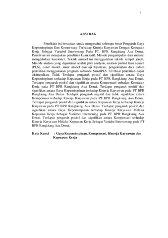 Penelitian ini bertujuan untuk mengetahui seberapa besar Pengaruh Gaya Kepemimpinan Dan Kompensasi Terhadap Kinerja Karyawan Dengan Kepuasan Kerja Sebagai Variabel Intervening Pada PT. BPR Rangkiang Aua Denai. Penelitian ini merepakan penelitian kuantitatif. Metode pengumpulan data melalui mengedarkan kuesioner. Teknik sampel ini menggunakan teknik sampel jenuh. Metode analisis yang digunakan adalah path analysis, analisis partial least aquare (PLS), outer model, inner model dan uji hipotesis, pengelolahan data dalam penelitian menggunakan program software SmartPLS 3.0 Hasil penelitian dapat disimpulkan, Tidak Terdapat pengaruh positif dan signifikan antara Gaya Kepemimpinan terhadap Kepuasan Kerja pada PT BPR Rangkiang Aua Denai. Terdapat pengaruh positif dan signifikan antara Kompensasi terhadap Kepuasan Kerja pada PT BPR Rangkiang Aua Denai. Terdapat pengaruh positif dan signifikan antara Gaya Kepemimpinan terhadap Kinerja Karyawan pada PT BPR Rangkiang Aua Denai. Terdapat pengaruh negatif dan tidak signifikan antara Kompensasi terhadap Kinerja Karyawan pada PT BPR Rangkiang Aua Denai. Terdapat pengaruh positif dan signifikan antara Kepuasan Kerja terhadap Kinerja Karyawan pada PT BPR Rangkiang Aua Denai. Terdapat pengaruh positif dan signifikan antara Gaya Kepemimpinan terhadap Kinerja Karyawan Melalui Kepuasan Kerja Sebagai Variabel Intervening pada PT BPR Rangkiang Aua Denai. Terdapat pengaruh positif dan signifikan antara Kompensasi terhadap Kinerja Karyawan Melalui Kepuasan Kerja Sebagai Variabel Intervening pada PT BPR Rangkiang Aua Denai. Kata Kunci : Gaya Kepemimpinan, Kompensasi, Kinerja Karyawan dan Kepuasan Kerja