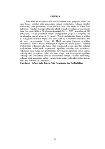 Penelitian ini bertujuan untuk melihat sejauh mana pengaruh inflasi dan suku bunga terhadap nilai perusahaan dengan profitabilitas sebagai variabel intervening pada perusahaan sektor industri dasar dan kimia di Bursa Efek Indonesia. Populasi dalam penelitian ini adalah seluruh perusahaan sektor industri dasar dan kimia di Bursa Efek Indonesia periode 2019 – 2023 yaitu sebanyak 110 perusahaan. Teknik pemilihan sampel menggunakan purposive sampling dan mendapatkan sampel sebanyak 32 sampel. Teknik analisis data dalam penelitian ini menggunakan analisis regresi data panel, uji t, uji F, koefisien determinasi dan uji sobel menggunakan E-views 12. Hasil pengujian hipotesis penelitian menunjukan bahwa inflasi berpengaruh signifikan secara parsial terhadap profitabilitas, sedangkan suku bunga tidak berpengaruh secara signifikan terhadap profitabilitas. Inflasi tidak berpengaruh signifikan terhadap nilai perusahaan, sedangkan suku bunga dan profitabilitas berpengaruh signifikan secara parsial terhadap nilai perusahaan. Inflasi dan suku bunga tidak berpengaruh signifikan terhadap nilai perusahaan melalui profitabilitas sebagai variabel intervening, terhadap nilai perusahaan melalui variabel intervening pada sektor industri dasar dan kimia di Bursa Efek Indonesia. Kata kunci : Inflasi, Suku Bunga, Nilai Perusahaan dan Profitabilitas.