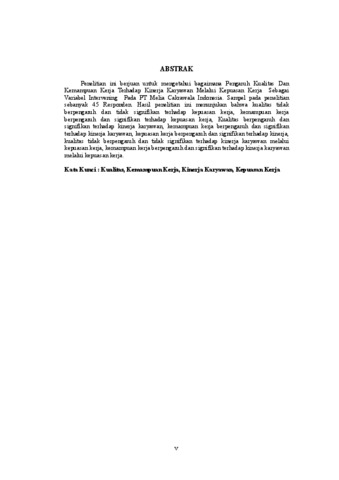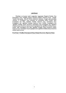 Penelitian ini berjuan untuk mengetahui bagaimana Pengaruh Kualitas DanKemampuan Kerja Terhadap Kinerja Karyawan Melalui Kepuasan Kerja Sebagai Variabel Intervening Pada PT Melia Cakrawala Indonesia. Sampel pada penelitiansebanyak 45 Responden. Hasil penelitian ini menunjukan bahwa kualitas tidakberpengaruh dan tidak signifikan terhadap kepuasan kerja, kemampuan kerjaberpengaruh dan signifikan terhadap kepuasan kerja, Kualitas berpengaruh dansignifikan terhadap kinerja karyawan, kemampuan kerja berpengaruh dan signifikanterhadap kinerja karyawan, kepuasan kerja berpengaruh dan signifikan terhadap kinerja, kualitas tidak berpengaruh dan tidak signifikan terhadap kinerja karyawan melalui kepuasan kerja, kemampuan kerja berpengaruh dan signifikan terhadap kinerja karyawanmelalui kepuasan kerja. Kata Kunci : Kualitas, Kemampuan Kerja, Kinerja Karyawan, Kepuasan Kerja