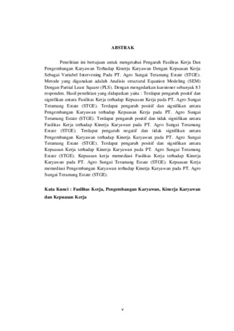Penelitian ini bertujuan untuk mengetahui Pengaruh Fasilitas Kerja Dan Pengembangan Karyawan Terhadap Kinerja Karyawan Dengan Kepuasan Kerja Sebagai Variabel Intervening Pada PT. Agro Sungai Teramang Estate (STGE). Metode yang digunakan adalah Analisis structural Equation Modeling (SEM) Dengan Partial Least Square (PLS). Dengan mengedarkan kuesioner sebanyak 83 responden. Hasil penelitian yang didapatkan yaitu : Terdapat pengaruh positif dan signifikan antara Fasilitas Kerja terhadap Kepuasan Kerja pada PT. Agro Sungai Teramang Estate (STGE). Terdapat pengaruh positif dan signifikan antara Pengembangan Karyawan terhadap Kepuasan Kerja pada PT. Agro Sungai Teramang Estate (STGE). Terdapat pengaruh positif dan tidak signifikan antara Fasilitas Kerja terhadap Kinerja Karyawan pada PT. Agro Sungai Teramang Estate (STGE). Terdapat pengaruh negatif dan tidak signifikan antara Pengembangan Karyawan terhadap Kinerja Karyawan pada PT. Agro Sungai Teramang Estate (STGE). Terdapat pengaruh positif dan signifikan antara Kepuasan Kerja terhadap Kinerja Karyawan pada PT. Agro Sungai Teramang Estate (STGE). Kepuasan kerja memediasi Fasilitas Kerja terhadap Kinerja Karyawan pada PT. Agro Sungai Teramang Estate (STGE). Kepuasan Kerja memediasi Pengembangan Karyawan terhadap Kinerja Karyawan pada PT. Agro Sungai Teramang Estate (STGE). Kata Kunci : Fasilitas Kerja, Pengembangan Karyawan, Kinerja Karyawan dan Kepuasan Kerja