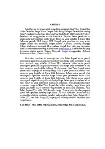 Penelitian ini bertujuan untuk mengetahui pengaruh Nilai Tukar Rupiah Dan Inflasi Terhadap Harga Saham Dengan Suku Bunga Sebagai Variabel Intervening Pada Perusahaan Sektor Basic Materials Yang Terdaftar Di BEI Periode 2019-2023. Penelitian ini menggunakan metode kuantitatif. Populasi dalam penelitian ini adalah seluruh Perusahaan Sektor Basic Materials yang terdaftar di Bursa Efek Indonesia periode 2019 hingga 2023. Sampel pada penelitian ini yang sesuai dengan kriteria dan ditentukan dengan metode Purposive Sampling sehingga didapat total sampel sebanyak 64 perusahaan sampel. Jenis data yang digunakan adalah jenis data sekunder yang diperoleh dari www.idx.co.id. Metode analisis yang digunakan adalah analisis Regresi Berganda dengan menggunakan Software Econometrik Views (Eviews) versi 10. Hasil dari penelitian ini menunjukkan Nilai Tukar Rupiah secara parsial berpengaruh positif dan signifikan terhadap Suku Bunga pada perusahaan sektor basic materials yang terdaftar di Bursa Efek Indonesia, Inflasi secara parsial berpengaruh positif dan signifikan terhadap Suku Bunga pada perusahaan sektor basic materials yang terdaftar di Bursa Efek Indonesia, Nilai Tukar Rupiah secara parsial tidak berpengaruh terhadap Harga Saham pada perusahaan sektor basic materials yang terdaftar di Bursa Efek Indonesia, Inflasi secara parsial tidak berpengaruh signifikan terhadap Harga Saham pada perusahaan sektor basic materials yang terdaftar di Bursa Efek Indonesia, Suku Bunga secara parsial berpengaruh negatif dan signifikan terhadap Harga Saham pada perusahaan sektor basic materials yang terdaftar di Bursa Efek Indonesia, Suku Bunga tidak dapat memediasi pengaruh Nilai Tukar Rupiah dan Inflasi terhadap Harga Saham pada perusahaan sektor basic materials yang terdaftar di Bursa Efek Indonesia, Nilai Tukar Rupiah (X1), inflsi (X2) dan suku bunga (Z) secara simultan berpengaruh positif dan signifikan terhadap harga saham (Y), Nilai Koefisien Determinasi (R₂) menunjukkan bahwa kontribusi variabel indenpenden Nilai Tukar Rupiah (X1), Inflasi (X2) dan Suku Bunga (Z) berpengaruh terhadap variabel dependen yaitu Harga Saham. Kata kunci : Nilai Tukar Rupiah, Inflasi, Suku Bunga dan Harga Saham