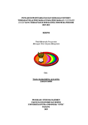 Alkaisya, Tiara Ramadhina (2025) PENGARUH PROFITABILITAS DAN KEBIJAKAN DIVIDEN TERHADAP NILAI PERUSAHAAN PADA PERUSAHAAN CONSUMER GOODS YANG TERDAFTAR DI BURSA EFEK INDONESIA PERIODE 2019-2023. Sarjana thesis, Universitas Putra Indonesia YPTK Padang.