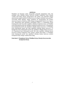 Penelitian ini bertujuan untuk mengetahui pengaruh pengalaman kerja dan pelatihan kerja terhadap kinerja karyawan dengan kompetensi kerja sebagai variabel intervening dengan menggunakan data primer yang diperoleh dengan menyebarkan angket kepada 49 orang karyawan sebagai responden yaitu pada PT. Travesindo Multi Elektrik. Dalam penelitian ini menggunakan alat analisis Structural Equation Modeling (SEM) dengan menggunakan Partial Least Square PLS. Berdasarkan hasil penelitian menunjukan bahwa (1) Pengalaman Kerja berpengaruh positif dan tidak signifikan terhadap kompetensi kerja. (2) Pelatihan kerja berpengaruh positif dan signifikan terhadap kompetensi kerja (3) Pengalaman keja berpengaruh positif dan signifikan terhadap kinerja karyawan. (4) Pelatihan kerja berpengaruh negatif dan tidak signifikan terhadap kinerja karyawan. (5) Kompetensi kerja berpengaruh positif dan signifikan terhadap kinerja karyawan. (6) Pengalaman kerja berpengaruh positif dan tidak signifikan terhadap kinerja karyawan melalui kompetensi kerja sebagai variabel intervening. (7) Pelatihan kerja berpengaruh positif dan signifikan terhadap kinerja karyawan melalui kompetensi kerja sebagai variabel intervening. Kata kunci : Pengalaman Kerja, Pelatihan Kerja, Kinerja Karyawan dan Kompetensi Kerja