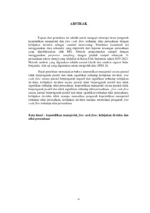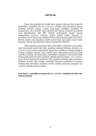 Tujuan dari penelitian ini adalah untuk menguji seberapa besar pengaruh kepemilikan manajerial dan free cash flow terhadap nilai perusahaan dengan kebijakan deviden sebagai variabel intervening. Penelitian kuantitatif ini menggunakan data sekunder yang diperoleh dari laporan keuangan perusahaan yang dipublikasikan oleh BEI. Metode pengumpulan sampel dengan menggunakan purposive sampling, dengan jumlah sampel sebanyak 11 perusahaan sektor energi yang terdaftar di Bursa Efek Indonesia tahun 2019-2023. Metode analisis yang digunakan adalah asumsi klasik dan analisis regresi linier berganda. Alat uji yang digunakan untuk mengolah data SPSS 26. Hasil penelitian menunjukan bahwa kepemilikan manajerial secara parsial tidak berpengaruh positif dan tidak signifikan terhadap kebijakan deviden, free cash flow secara parsial berpengaruh negatif dan signifikan terhadap kebijakan deviden, kebijakan deviden secara parsial tidak berpengaruh positif dan tidak signifikan terhadap nilai perusahaan, kepemilikan manajerial secara parsial tidak berpengaruh positif dan tidak signifikan terhadap nilai perusahaan , free cash flow secara parsial berpengaruh positif dan tidak signifikan terhadap nilai perusahaan, kebijakan deviden tidak mampu memediasi pengaruh kepemilikan manajerial terhadap nilai perusahaan, kebijakan deviden mampu memediasi pengaruh free cash flow terhadap nilai perusahaan. Kata kunci : kepemilikan manajerial, free cash flow, kebijakan deviden dan nilai perusahaan