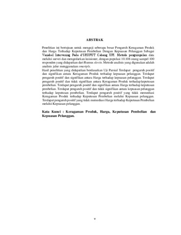 Penelitian ini bertujuan untuk menguji seberapa besar Pengaruh Keragaman Produk dan Harga Terhadap Keputusan Pembelian Dengan Kepuasan Pelanggan Sebagai Variabel Intervening Pada d’SRUPUT Cabang UPI. Metode pengumpulan data melalui survei dan mengedarkan kuisioner, dengan populasi 10.108 orang sampel 100 responden yang didapatkan dari Rumus slovin. Metode analisis yang digunakan adalah analisis jalur menggunakan smartpls. Hasil penelitian yang didapatkan berdasarkan Uji Parsial Terdapat pengaruh positif dan signifikan antara Keragaman Produk terhadap kepuasan pelanggan. Terdapat pengaruh positif dan signifikan antara Harga terhadap kepuasan pelanggan. Terdapat pengaruh positif dan tidak signifikan antara Keragaman Produk terhadap keputusan pembelian. Terdapat pengaruh positif dan signifikan antara Harga terhadap keputusan pembelian. Terdapat pengaruh positif dan tidak signifikan antara kepuasan pelanggan terhadap keputusan pembelian. Terdapat pengaruh positif yang tidak memediasi Keragaman Produk terhadap Keputusan Pembelian melalui Kepuasan pelanggan. Terdapat pengaruh positif yang tidak memediasi Harga terhadap Keputusan Pembelian melalui Kepuasan pelanggan. Kata Kunci : Keragaman Produk, Harga, Keputusan Pembelian dan Kepuasan Pelanggan.