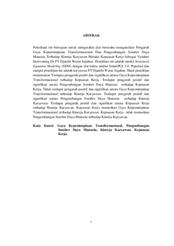 Penelitian ini bertujuan untuk mengetahui dan berusaha menganalisis Pengaruh Gaya Kepemimpinan Transformasional Dan Pengembangan Sumber Daya Manusia Terhadap Kinerja Karyawan Melalui Kepuasan Kerja Sebagai Variabel Intervening Di PT Djambi Waras Jujuhan. Penelitian ini adalah model Structural Equation Modeling (SEM) dengan alat bantu analisi SmartPLS 3.0. Populasi dan sampel penelitian ini adalah karyawan PT Djambi Waras Jujuhan. Hasil penelitian menemukan Terdapat pengaruh positif dan signifikan antara Gaya Kepemimpinan Transformasional terhadap Kepuasan Kerja. Terdapat pengaruh positif dan signifikan antara Pengembangan Sumber Daya Manusia terhadap Kepuasan Kerja. Tidak terdapat pengaruh positif dan signifikan antara Gaya Kepemimpinan Transformasional terhadap Kinerja Karyawan. Terdapat pengaruh positif dan signifikan antara Pengembangan Sumber Daya Manusia terhadap Kinerja Karyawan. Terdapat pengaruh positif dan signifikan antara Kepuasan Kerja terhadap Kinerja Karyawan. Kepuasan Kerja memediasi Gaya Kepemimpinan Transformasional terhadap Kinerja Karyawan. Kepuasan Kerja tidak memediasi Pengembangan Sumber Daya Manusia terhadap Kinerja Karyawan. Kata Kunci: Gaya Kepemimpinan Transformasional, Pengembangan Sumber Daya Manusia, Kinerja Karyawan, Kepuasan Kerja.