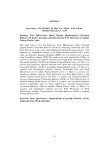 Penelitian ini bertujuan untuk menguji Model Efektivitas Kerja Karyawan Melalui Organizational Citizenship Behaviour (OCB) Dengan Menganalisis Gaya Kepemimpinan Dan Motivasi Kerja dengan menggunakan data primer yang diperoleh dengan menyebarkan angket kepada 60 orang karyawan sebagai responden yaitu pada Puskesmas Andalas Padang. Dalam penelitian ini menggunakan alat analisis Structural Equation Modeling (SEM) versi 3 dengan menggunakan Partial Least Square (PLS). Hasil penelitian menunjukkan bahwa (1) Terdapat pengaruh positif dan signifikan antara Gaya Kepemimpinan terhadap Organizational Citizenship Behaviour (OCB) pada Puskesmas Andalas Padang. (2) Terdapat pengaruh positif dan signifikan antara Motivasi Kerja terhadap Organizational Citizenship Behaviour (OCB) pada Puskesxmas Andalas Padang. (3) Terdapat pengaruh negatif dan tidak signifikan antara Gaya Kepemimpinan terhadap Efektivitas Kerja pada Puskesmas Andalas Padang. (4) Terdapat pengaruh positif dan signifikan antara Motivasi Kerja terhadap Efektivitas Kerja pada Puskesmas Andalas Padang. (5) Terdapat pengaruh positif dan signifikan antara Organizational Citizenship Behaviour (OCB) terhadap Efektivitas Kerja pada Puskesmas Andalas Padang. (6) Terdapat pengaruh positif dan signifikan antara Gaya Kepemimpinan terhadap Efektivitas Kerja melalui Organizational Citizenship Behaviour (OCB) pada Puskesmas Andalas Padang. (7 )Terdapat pengaruh negatif dan tidak signifikan antara Motivasi Kerja terhadap Efektivitas Kerja melalui Organizational Citizenship Behaviour (OCB) pada Puskesmas Andalas Padang. Kata kunci: Efektivitas Kerja, Organizational Citizenship Behaviour (OCB), Gaya Kepemimpinan, Motivasi Kerja.