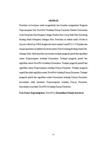 Penelitian ini bertujuan untuk mengatahuhi dan berusaha menganalisis Pengaruh Kepemimpinan Dan TeamWork Terhadap Kinerja Karyawan Melalui Komunikasi Antar Karyawan Dan Pimpinan Sebagai Variabel Intervening Pada Toko Kelontong Bintang Abadi Kabupaten Indragiri Hulu. Penelitian ini adalah model Struktural Equation Modeling (SEM) dengan alat bantu analisis SmartPLS 3.2.9 Populasi dan sampel penelitian ini adalah seluruh karyawan Toko Kelontong Bintang Abadi Kab. Indragiri Hulu. Hasil penelitan menemukan terdapat pengaruh positif dan signifikan antara Kepemimpinan terhadap Komunikasi. Terdapat pengaruh positif dan signifikan antara TeamWork terhadap Komunikasi. Terdapat pengaruh posistif dan signifikan antara Kepemimpinan terhadap Kinerja Karyawan. Terdapat pengaruh negatif dan tidak signifikan antara TeamWork terhadap Kinerja Karyawan. Terdapat pengaruh positif dan signifikan antara Komunikasi terhadap Kinerja Karyawan. komunikasi tidak dimediasi Kepemimipinan terhadap Kinerja Karyawan. komunikasi memediasi TeamWork terhadap Kinerja Karyawan. Kata Kunci: Kepemimpinan, TeamWork, Komunikasi, Kinerja karyawan