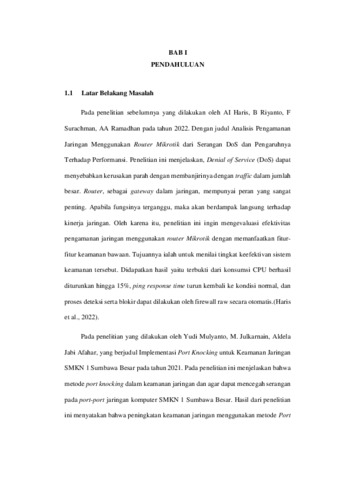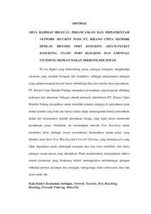 Di era digital yang berkembang pesat, jaringan komputer menghadapi ancaman yang semakin beragam dan kompleks, sehingga pengamanan jaringan yang optimal menjadi krusial untuk melindungi data dan sumber daya perusahaan. PT. Rizano Cipta Mandiri Padang merupakan perusahaan yang bergerak dibidang makanan dan minuman. Sebagai sebuah pemasok (distributor) PT. Rizano Cipta Mandiri Padang diwajibkan untuk memiliki koneksi jaringan di perusahaan tetap dalam kondisi yang baik dan lancar karena dapat memengaruhi kinerja perusahaan dalam hal menentukan jumlah persediaan barang yang tepat untuk memenuhi permintaan pasar. Penelitian ini menerapkan metode Port Knocking untuk membuka akses jaringan secara tersembunyi berdasarkan urutan paket yang dikirim, serta Static Port Blocking dan Firewall Filtering, yang menutup port yang tidak digunakan untuk mencegah serangan dari luar serta memfilter lalu lintas jaringan sesuai aturan yang ditetapkan. Hasil implementasi menunjukkan bahwa sistem keamanan yang dirancang efektif meningkatkan perlindungan jaringan terhadap potensi ancaman dan serangan, mengurangi risiko kebocoran data dan akses tidak sah. Kata Kunci: Keamanan Jaringan, Network, Security, Port, Knocking, Blocking, Firewall, Filtering, MikroTik