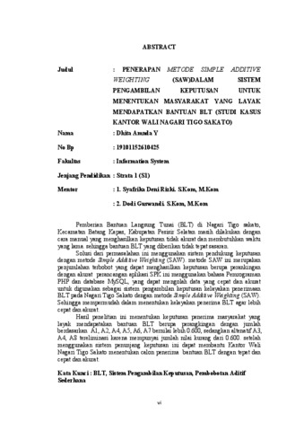 Pemberian Bantuan Langsung Tunai (BLT) di Nagari Tigo sakato, Kecamatan Batang Kapas, Kabupatan Pesisir Selatan masih dilakukan dengan cara manual yang menghasilkan keputusan tidak akurat dan membutuhkan waktu yang lama. sehingga bantuan BLT yang diberikan tidak tepat sasaran. Solusi dari permasalahan ini menggunakan sistem pendukung keputusan dengan metode Simple Additive Weighting (SAW). metode SAW ini merupakan penjumlahan terbobot yang dapat menghasilkan keputusan berupa perankingan dengan akurat perancangan aplikasi SPK ini menggunakan bahasa Pemrograman PHP dan database MySQL, yang dapat mengolah data yang cepat dan akurat untuk digunakan sebagai sistem pengambilan keputusan kelayakan penerimaan BLT pada Nagari Tigo Sakato dengan metode Simple Additive Weighting (SAW). Sehingga mempermudah dalam menentukan kelayakan penerima BLT agar lebih cepat dan akurat. Hasil penelitian ini menentukan keputusan penerima masyarakat yang layak mendapatakan bantuan BLT berupa perangkingan dengan jumlah berdasarkan A1, A2, A4, A5, A6, A7 bernilai lebih 0.600, sedangkan altenatif A3, A4, A8 tereliminasi karena mempunyai jumlah nilai kurang dari 0.600. setelah menggunakan sistem penunjang keputusan ini dapat membantu Kantor Wali Nagari Tigo Sakato menentukan calon penerima bantuan BLT dengan tepat dan cepat dan akurat. Kata Kunci : BLT, Sistem Pengambilan Keputusan, Pembobotan Aditif Sederhana