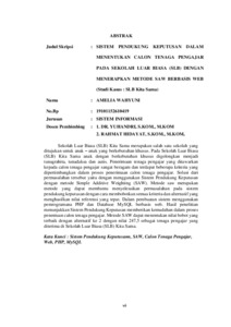 Sekolah Luar Biasa (SLB) Kita Sama merupakan salah satu sekolah yang ditujukan untuk anak – anak yang berkebutuhan khusus. Pada Sekolah Luar Biasa (SLB) Kita Sama anak dengan berkebutuhan khusus digolongkan menjadi tunagrahita, tunadaksa dan autis. Penerimaan tenaga pengajar yang ditawarkan kepada calon tenaga pengajar sangat beragam dan terdapat beberapa kriteria yang dipertimbangkan dalam proses penerimaan calon tenaga pengajar. Solusi dari permasalahan tersebut yaitu dengan menggunakan Sistem Pendukung Keputusan dengan metode Simple Additive Weighting (SAW). Metode saw merupakan metode yang dapat membantu menyelesaikan permasalahan pada sistem pendukung keputusan dengan cara membobotkan semua kriteria dan alternatif yang menghasilkan nilai referensi yang tepat. Dalam pembuatan sistem menggunakan pemrogramana PHP dan Database MySQL berbasis web. Hasil penelitian menunjukkan Sistem Pendukung Keputusan memberikan kemudahan dalam proses penentuan calon tenaga pengajar. Metode SAW dapat menentukan nilai bobot yang terbaik dengan alternatif ke 2 dengan nilai 247,5 sebagai tenaga pengajar yang diterima di Sekolah Luar Biasa (SLB) Kita Sama. Kata Kunci : Sistem Pendukung Keputusann, SAW, Calon Tenaga Pengajar, Web, PHP, MySQL