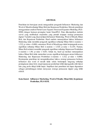 Penelitian ini bertujuan untuk menganalisis pengaruh Influencer Marketing dan Word of Mouth terhadap Minat Beli dan Keputusan Pembelian. Metode penelitian menggunakan analisis Partial Least Squares-Structural Equation Modeling (PLSSEM) dengan bantuan perangkat lunak SmartPLS. Data dikumpulkan melalui survei yang melibatkan responden yang pernah terpapar strategi pemasaran digital. Variabel yang diuji meliputi Influencer Marketing, Word of Mouth, Minat Beli, dan Keputusan Pembelian. Hasil analisis menunjukkan bahwa Influencer Marketing tidak memiliki pengaruh signifikan terhadap Minat Beli (t-statistic = 1,522; p-value = 0,000), sementara Word of Mouth juga tidak berpengaruh secara signifikan terhadap Minat Beli (t-statistic = 3,520; p-value = 0,129). Namun, Minat Beli terbukti memiliki pengaruh signifikan terhadap Keputusan Pembelian (t-statistic > 1,96; p-value < 0,05). Selain itu, hasil uji mediasi menunjukkan bahwa Minat Beli tidak memediasi secara signifikan hubungan antara Influencer Marketing dan Keputusan Pembelian (t-statistic = 1,522; p-value = 0,000). Kesimpulan penelitian ini mengindikasikan bahwa strategi pemasaran berbasis influencer dan word of mouth tidak selalu berdampak langsung terhadap peningkatan minat beli, tetapi keputusan pembelian lebih dipengaruhi oleh faktor lain yang perlu dikaji lebih lanjut. Implikasi dari penelitian ini dapat digunakan sebagai pertimbangan dalam menyusun strategi pemasaran digital yang lebih efektif. Kata Kunci: Influencer Marketing, Word of Mouth, Minat Beli, Keputusan Pembelian, PLS-SEM.