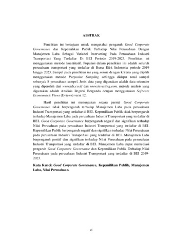 Penelitian ini bertujuan untuk mengetahui pengaruh Good Corporate Governance dan Kepemilikan Publik Terhadap Nilai Perusahaan Dengan Manajemen Laba Sebagai Variabel Intervening Pada Perusahaan Industri Transportasi Yang Terdaftar Di BEI Periode 2019-2023. Penelitian ini menggunakan metode kuantitatif. Populasi dalam penelitian ini adalah seluruh perusahaan transportasi yang terdaftar di Bursa Efek Indonesia periode 2019 hingga 2023. Sampel pada penelitian ini yang sesuia dengan kriteria yang dipilih menggunakan metode Purposive Sampling sehingga didapat total sampel sebanyak 8 perusahaan sampel. Jenis data yang digunakan adalah data sekunder yang diperoleh dari www.idx.co.id dan www.investing.com. metode analisis yang digunakan adalah Analisis Regresi Berganda dengan menggunakan Software Econometric Views (Eviews) versi 12. Hasil penelitian ini menunjukan secara parsial Good Corporate Governance tidak berpengaruh terhadap Manajemen Laba pada perusahaan Industri Transportasi yang terdaftar di BEI. Kepemilikan Publik tidak berpengaruh terhadap Manajemen Laba pada perusahaan Industri Transportasi yang terdaftar di BEI. Good Corporate Governance berpengaruh negatif dan signifikan terhadap Nilai Perusahaan pada perusahaan Industri Transportasi yang terdaftar di BEI. Kepemilikan Publik berpengaruh negatif dan signifikan terhadap Nilai Perusahaan pada perusahaan Industri Transportasi yang terdaftar di BEI. Manajemen Laba berpengaruh positif dan signifikan terhadap Nilai Perusahaan pada perusahaan Industri Transportasi yang terdaftar di BEI. Manajemen Laba dapat memediasi pengaruh Good Corporate Governance dan Kepemilikan Publik Terhadap Nilai Perusahaan pada perusahaan Industri Transportasi yang terdaftar di BEI 2019- 2023. Kata Kunci: Good Corporate Governance, Kepemilikan Publik, Manajemen Laba, Nilai Perusahaan.
