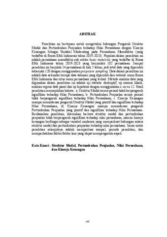 Penelitian ini bertujuan untuk mengetahui hubungan Pengaruh Struktur Modal dan Pertumbuhan Penjualan terhadap Nilai Perusahaan dengan Kinerja Keuangan Sebagai Variabel Moderating pada Perusahaan Manufaktur (yang terdaftar di Bursa Efek Indonesia tahun 2019-2023). Populasi dalam penelitian ini adalah perusahaan manufaktur sub sektor basic materials yang terdaftar di Bursa Efek Indonesia tahun 2019-2023 yang berjumlah 102 perusahaan. Sampel penelitian ini berjulah 24 perusahaan di kali 5 tahun, jadi total data yang diperoleh sebanyak 120 dengan menggunakan purposive sampling. Data dalam penelitian ini adalah data sekunder berupa data tahunan yang diperoleh dari website resmi Bursa Efek Indonesia dan situs resmi perusahaan yang terkait. Metode analisis data yang digunakan dalam penelitian ini adalah uji statistic deskriptif, uji asumsi klasik, analisis regresi data panel dan uji hipotesis dengan menggunakan e-views 12. Hasil penelitian menunjukkan bahwa : a. Struktur Modal secara persial tidak berpengaruh signifikan terhadap Nilai Perusahaan, b. Pertumbuhan Penjualan secara persial tidak berpengaruh signifikan terhadap Nilai Perusahaan, c. Kinerja Keuangan mampu memoderasi pengaruh Struktur Modal yang positif dan signifikan terhadap Nilai Perusahaan, d) Kinerja Keuangan mampu memoderasi pengaruh Pertumbuhan Penjualan yang positif dan signifikan terhadap Nilai Perusahaan. Berdasarkan penelitian, ditemukan bahwa struktur modal dan pertumbuhan penjualan tidak berpengaruh signifikan terhadap nilai perusahaan, namun kinerja keuangan berfungsi sebagai variabel moderasi yang memperkuat hubungan antara struktur modal dan pertumbuhan penjualan terhadap nilai perusahaan. Saran untuk penelitian selanjutnya adalah memperluas sampel, periode penelitian, dan memperhatikan faktor-faktor lain yang dapat mempengaruhi aspek. Kata Kunci : Struktur Modal, Pertumbuhan Penjualan, Nilai Perusahaan, dan Kinerja Keuangan