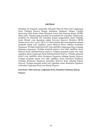 Penelitian ini bertujuan mengetahui Pengaruh Motivasi Kerja Dan Lingkungan Kerja Terhadap Pegawai Dengan Komitmen Organisasi Sebagai Variabel Intervening Pada Kantor Dinas Pekerjaan Umum Dan Penataan Ruang (PUPR) Muko-muko. Populasi pada penelitian ini berjumlah 104 responden. Sampel pada penelitian ini berjumlah 104 responden dengan menggunakan teknis sampling jenuh. Metode yang digunakan adalah Structural Equation Modeling (SEM) dengan partial least square (PLS) 3.0. Hasil analisis data menyimpulkan terdapat pengaruh positif serta signifikan antara Motivasi Kerja terhadap Komitmen Organisasi. Terdapat pengaruh positif yang signifikan Lingkungan Kerja terhadap Komitmen Organisasi. Terdapat pengaruh negative serat tidak signifikan antara Motivasi Kerja terhadap Kinerja pegawai. Terdapat pengaruh negatif serta tidak signifikan antara Lingkungan Kerja terhadap Kinerja Pegawai. Terdapat pengaruh positif yang signifikan antara Komitmen Organisasi terhadap Kinerja Pegawai. Terdapat pengaruh negatif serta tidak signifikan antara Komitmen Organisasi Terhadap Komitmen Organisasi memediasi Motivasi Kerja terhadap Kinerja Pegawai. Terdapat pengaruh positif serta signifikan antara Komitmen Organisasi memediasi Lingkungan Kerja atas Kinerja Pegawai. Kata Kunci: Motivasi Kerja, Lingkungan Kerja, Komitmen Organisasi, Kinerja Pegawai.