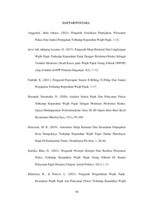 Tujuan Penelitian ini adalah untuk mengetahui Sanksi Perpajakan, Pelayanan Fiskus, Sikap Rasional Terhadap Kepatuhan Wajib Pajak dan apakah Preferensi Risiko mampu Memoderasi Sanksi Perpajakan, Pelayanan Fiskus, Sikap Rasional terhadap Kepatuhan Wajib Pajak orang pribadi. metode pengumpulan data melalui kuesioner, dengan sampel 100 responden wajib pajak orang pribadi yang terdaftar di KPP Pratama Solok. Metode analisis yang digunakan adalah analisis regresi linear berganda dan moderated regresion analysis (MRA) dengan menggunakan SPSS 26. Hasil yang didapat secara parsial (uji-t) adalah sanksi perpajakan, pelayanan fiskus dan sikap rasional berpengaruh positif dan signifikan terhadap kepatuhan wajib pajak. Preferensi risiko tidak mampu memoderasi Pengaruh sanksi perpajakan, pelayanan fiskus, dan sikap rasional terhadap kepatuhan wajib pajak. Kata Kunci: Sanksi Perpajakan, Pelayanan Fiskus, Sikap Rasional, Kepatuhan Wajib Pajak, Preferensi Risiko.