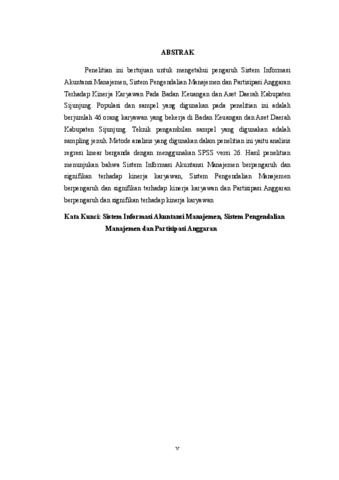 Penelitian ini bertujuan untuk mengetahui pengaruh Sistem Informasi Akuntansi Manajemen, Sistem Pengendalian Manajemen dan Partisipasi Anggaran Terhadap Kinerja Karyawan Pada Badan Keuangan dan Aset Daerah Kabupaten Sijunjung. Populasi dan sampel yang digunakan pada penelitian ini adalah berjumlah 46 orang karyawan yang bekerja di Badan Keuangan dan Aset Daerah Kabupaten Sijunjung. Teknik pengambilan sampel yang digunakan adalah sampling jenuh. Metode analisis yang digunakan dalam penelitian ini yaitu analisis regresi linear berganda dengan menggunakan SPSS versi 26. Hasil penelitian menunjukan bahwa Sistem Informasi Akuntansi Manajemen berpengaruh dan signifikan terhadap kinerja karyawan, Sistem Pengendalian Manajemen berpengaruh dan signifikan terhadap kinerja karyawan dan Partisipasi Anggaran berpengaruh dan signifikan terhadap kinerja karyawan Kata Kunci: Sistem Informasi Akuntansi Manajemen, Sistem Pengendalian Manajemen dan Partisipasi Anggaran