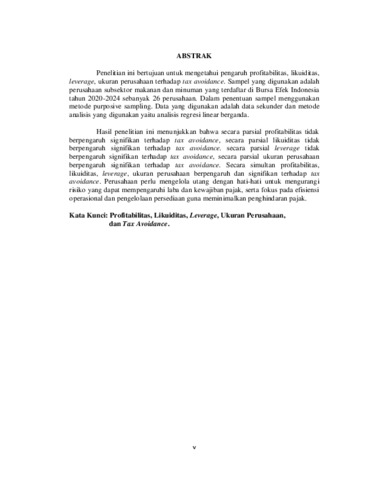 Penelitian ini bertujuan untuk mengetahui pengaruh profitabilitas, likuiditas, leverage, ukuran perusahaan terhadap tax avoidance. Sampel yang digunakan adalah perusahaan subsektor makanan dan minuman yang terdaftar di Bursa Efek Indonesia tahun 2020-2024 sebanyak 26 perusahaan. Dalam penentuan sampel menggunakan metode purposive sampling. Data yang digunakan adalah data sekunder dan metode analisis yang digunakan yaitu analisis regresi linear berganda. Hasil penelitian ini menunjukkan bahwa secara parsial profitabilitas tidak berpengaruh signifikan terhadap tax avoidance, secara parsial likuiditas tidak berpengaruh signifikan terhadap tax avoidance. secara parsial leverage tidak berpengaruh signifikan terhadap tax avoidance, secara parsial ukuran perusahaan berpengaruh signifikan terhadap tax avoidance. Secara simultan profitabilitas, likuiditas, leverage, ukuran perusahaan berpengaruh dan signifikan terhadap tax avoidance. Perusahaan perlu mengelola utang dengan hati-hati untuk mengurangi risiko yang dapat mempengaruhi laba dan kewajiban pajak, serta fokus pada efisiensi operasional dan pengelolaan persediaan guna meminimalkan penghindaran pajak. Kata Kunci: Profitabilitas, Likuiditas, Leverage, Ukuran Perusahaan, dan Tax Avoidance.