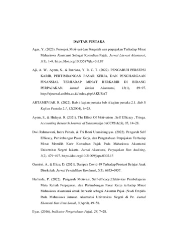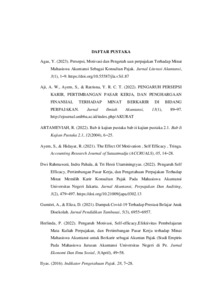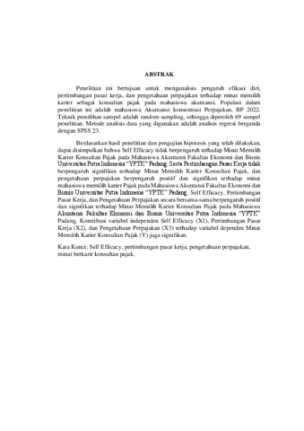 Samoloisa, Piana Yuhelni (2025) PENGARUH SELF EFFICACY, PERTIMBANGAN PASAR KERJA, DAN PENGETAHUAN PERPAJAKAN TERHADAP MINAT MEMILIH KARIR KONSULTAN PAJAK PADA MAHASISWA AKUNTANSI UNIVERSITAS PUTRA INDONESIA. Sarjana thesis, Universitas Putra Indonesia YPTK Padang.