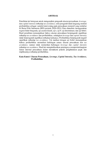 Penelitian ini bertujuan untuk menganalisis pengaruh ukuran perusahaan, leverage, dan capital intensity terhadap tax avoidance, serta pengaruh tidak langsung melalui profitabilitas sebagai variabel intervening pada perusahaan otomotif yang terdaftar di Bursa Efek Indonesia (BEI) periode 2020–2024. Data dianalisis menggunakan regresi linier berganda, uji asumsi klasik, uji t, uji F, uji determinasi, dan uji Sobel. Hasil penelitian menunjukkan bahwa ukuran perusahaan berpengaruh signifikan terhadap tax avoidance dan profitabilitas, sedangkan leverage dan capital intensity tidak berpengaruh signifikan terhadap keduanya. Profitabilitas berpengaruh negatif signifikan terhadap tax avoidance. Uji mediasi dengan uji Sobel menunjukkan bahwa profitabilitas memediasi hubungan antara ukuran perusahaan dan tax avoidance, namun tidak memediasi hubungan leverage dan capital intensity terhadap tax avoidance. Hasil ini mengindikasikan pentingnya mempertimbangkan faktor internal perusahaan dalam memahami praktik penghindaran pajak dan implikasinya terhadap profitabilitas. Kata Kunci: Ukuran Perusahaan, Leverage, Capital Intensity, Tax Avoidance, Profitabilitas