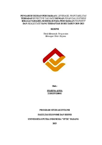 Aisya, Syabina (2025) PENGARUH UKURAN PERUSAHAAN, LEVERAGE, PROFITABILITAS TERHADAP EFFECTIVE TAX RATE DENGAN FINANCIAL DISTRESS SEBAGAI VARIABEL MODERASI PADA PERUSAHAAN PROPERTY DAN REALESTATE YANG TERDAFTAR DI BEI TAHUN 2019-2023. Sarjana thesis, Universitas Putra Indonesia YPTK Padang.