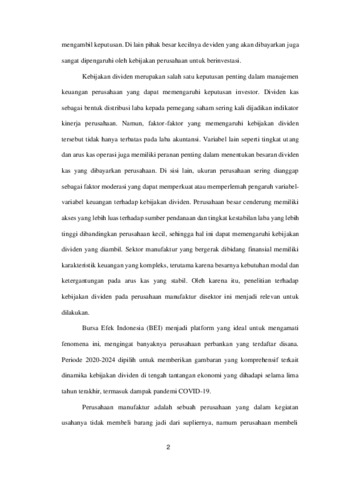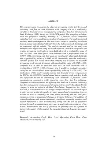 Penelitian ini bertujuan untuk menganalisis pengaruh laba akuntansi, tingkat utang, dan arus kas operasi terhadap dividen kas, dengan ukuran perusahaan sebagai variabel moderasi pada perusahaan manufaktur sektor finansial yang terdaftar di Bursa Efek Indonesia (BEI) selama periode 2020–2024. Teknik Pengambilan sampel yang digunakan adalah purposive sampling dan didapatkan sebanyak 13 perusahaan sektor financial dikali 5 tahun sehingga total data yang diperoleh sebanyak 65. Metode analisis yang digunakan regresi moderasi. Data dalam penelitian ini adalah data sekunder berupa data tahunan yang diperoleh resmi dari Bursa Efek Indonesia, situs resmi terkait Perusahaan tersebut. Metode Analisi yang digunakan dalam penelitian ini adalah regresi linear berganda dengan menggunakan software Eviews 09. Berdasarkan hasil uji secara parsial bahwa laba akuntansi berpengaruh terhadap dividen kas dengan nilai profitabilitas 0.0114 < 0,05. Tingkat utang berpengaruh terhadap dividen kas dengan nilai profitabilitas 0,0034 < 0,05. Arus kas operasi tidak berpengaruh signifikan terhadap dividen kas dengan nilai profitabilitas 0,0845 > 0,05. Sedangkan dengan variable moderasi hasil uji secara parsial ukuran Perusahaan tidak mampu memoderasi laba akuntansi terhadap dividen kas dengan nilai profitabilitas 0,9145 > 0,05. Ukuran Perusahaan mampu memoderasi tongkat utang terhadap dividen kas dengan profitabilitas 0,0243 < 0,05. Ukuran Perusahaan tidak mampu memoderasi arus kas operasi terhadap dividen kas dengan nilai profitabilitas 0,1470 > 0,05. Implikasi dari hasil penelitian ini menunjukkan bahwa perusahaan sektor financial di BEI periode 2020-2024 menyebutkan bahwa laba akuntansi dan tingkat utang merupakan faktor signifikan dalam menentukan dividen kas pada perusahaan manufaktur sektor finansial, sementara arus kas operasi kurang berpengaruh. Ukuran perusahaan hanya memoderasi pengaruh tingkat utang terhadap dividen, menunjukkan bahwa strategi pengelolaan utang dan kebijakan dividen perlu disesuaikan dengan skala perusahaan untuk mengoptimalkan pembagian dividen. Saran untuk Untuk penelitian selanjutnya, disarankan menggunakan sampel yang lebih besar atau memperluas objek penelitian ke sektor lain agar hasil lebih general dan dapat dibandingkan antar sektor, serta memperpanjang periode data termasuk masa sebelum dan sesudah pandemi untuk memahami perubahan perilaku dividen. Penambahan variabel eksternal seperti kondisi makro ekonomi, struktur kepemilikan, dan reputasi auditor juga dianjurkan. Kata Kunci: Laba Akuntansi, Tingkat Utang, Arus Kas Operasi , Dividen Kas dan Ukuran Perusahaan.