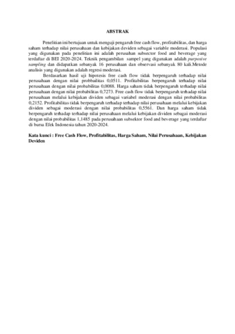 Penelitian ini bertujuan untuk menguji pengaruh free cash flow, profitabilitas, dan harga saham terhadap nilai perusahaan dan kebijakan deviden sebagai variable moderasi. Populasi yang digunakan pada penelitian ini adalah perusahan subsector food and beverage yang terdaftar di BEI 2020-2024. Teknik pengambilan sampel yang digunakan adalah purposive sampling dan didapatkan sebanyak 16 perusahaan dan observasi sebanyak 80 kali.Metode analisis yang digunakan adalah regresi moderasi. Berdasarkan hasil uji hipotesis free cash flow tidak berpengaruh terhadap nilai perusahaan dengan nilai probbailitas 0,0511. Profitabilitas berpengaruh terhadap nilai perusahaan dengan nilai probabilitas 0,0088. Harga saham tidak berpengaruh terhadap nilai perusahaan dengan nilai probabilitas 0,7273. Free cash flow tidak berpengaruh terhadap nilai perusahaan melalui kebijakan dividen sebagai variabel moderasi dengan nilai probabilitas 0,2152. Profitabilitas tidak berpengaruh terhadap terhadap nilai perusahaan melalui kebijakan dividen sebagai moderasi dengan nilai probabilitas 0,5561. Dan harga saham tidak berpengaruh terhadap terhadap nilai perusahaan melalui kebijakan dividen sebagai moderasi dengan nilai probabilitas 1,1485 pada perusahaan subsektor food and beverage yang terdaftar di bursa Efek Indonesia tahun 2020-2024. Kata kunci : Free Cash Flow, Profitabilitas, Harga Saham, Nilai Perusahaan, Kebijakan Deviden