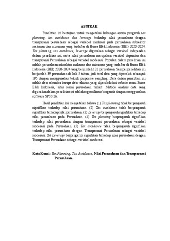 Penelitian ini bertujuan untuk mengetahui hubungan antara pengaruh tax planning, tax avoidance dan leverage terhadap nilai perusahaan dengan transparansi perusahaan sebagai variabel moderasi pada perusahaan subsektor makanan dan minuman yang terdaftar di Bursa Efek Indonesia (BEI) 2020-2024. Tax planning, tax avoidance, leverage digunakan sebagai variabel independen dalam penelitian ini, serta nilai perusahaan merupakan variabel dependen dan transparansi Perusahaan sebagai variabel moderasi. Populasi dalam penelitian ini adalah perusahaan subsektor makanan dan minuman yang terdaftar di Bursa Efek Indonesia (BEI) 2020-2024 yang berjumlah 132 perusahaan. Sampel penelitian ini berjumlah 39 perusahaan di kali 5 tahun, jadi total data yang diperoleh sebanyak 195 dengan menggunakan teknik purposive sampling. Data dalam penelitian ini adalah data sekunder berupa data tahunan yang diperoleh dari website resmi Bursa Efek Indonesia, situs resmi perusahaan terkait. Metode analisis data yang digunakan dalam penelitian ini adalah regresi linear berganda dengan menggunakan software SPSS 26. Hasil penelitian ini menyatakan bahwa (1) Tax planning tidak berpengaruh signifikan terhadap nilai perusahaan. (2) Tax avoidance tidak berpengaruh signifikan terhadap nilai perusahaan. (3) Leverage berpengaruh signifikan terhadap nilai perusahaan pada Perusahaan. (4) Tax planning berpengaruh signifikan terhadap nilai perusahaan dengan transparansi perusahaan sebagai variabel moderasi pada Perusahaan. (5) Tax avoidance tidak berpengaruh signifikan terhadap nilai perusahaan dengan Transparansi Perusahaan sebagai variabel moderasi. (6) Leverage berpengaruh signifikan terhadap nilai perusahaan dengan Transparansi Perusahaan sebagai variabel moderasi. Kata Kunci: Tax Planning, Tax Avoidance, Nilai Perusahaan dan Transparansi Perusahaan.