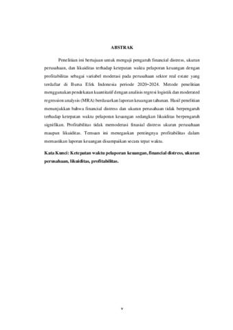 Penelitian ini bertujuan untuk menguji pengaruh financial distress, ukuran perusahaan, dan likuiditas terhadap ketepatan waktu pelaporan keuangan dengan profitabilitas sebagai variabel moderasi pada perusahaan sektor real estate yang terdaftar di Bursa Efek Indonesia periode 2020–2024. Metode penelitian menggunakan pendekatan kuantitatif dengan analisis regresi logistik dan moderated regression analysis (MRA) berdasarkan laporan keuangan tahunan. Hasil penelitian menunjukkan bahwa financial distress dan ukuran perusahaan tidak berpengaruh terhadap ketepatan waktu pelaporan keuangan sedangkan likuiditas berpengaruh signifikan. Profitabilitas tidak memoderasi finasial distress ukuran perusahaan maupun likuiditas. Temuan ini menegaskan pentingnya profitabilitas dalam memastikan laporan keuangan disampaikan secara tepat waktu. Kata Kunci: Ketepatan waktu pelaporan keuangan, financial distress, ukuran perusahaan, likuiditas, profitabilitas.