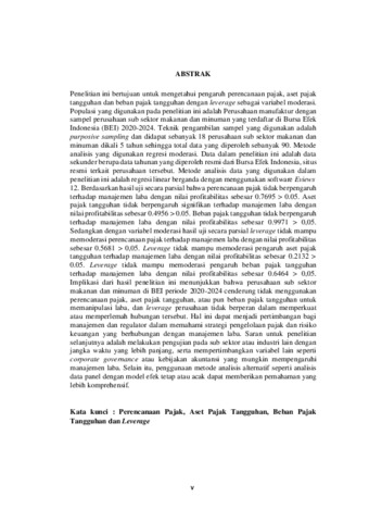 Penelitian ini bertujuan untuk mengetahui pengaruh perencanaan pajak, aset pajak tangguhan dan beban pajak tangguhan dengan leverage sebagai variabel moderasi. Populasi yang digunakan pada penelitian ini adalah Perusahaan manufaktur dengan sampel perusahaan sub sektor makanan dan minuman yang terdaftar di Bursa Efek Indonesia (BEI) 2020-2024. Teknik pengambilan sampel yang digunakan adalah purposive sampling dan didapat sebanyak 18 perusahaan sub sektor makanan dan minuman dikali 5 tahun sehingga total data yang diperoleh sebanyak 90. Metode analisis yang digunakan regresi moderasi. Data dalam penelitian ini adalah data sekunder berupa data tahunan yang diperoleh resmi dari Bursa Efek Indonesia, situs resmi terkait perusahaan tersebut. Metode analisis data yang digunakan dalam penelitian ini adalah regresi linear berganda dengan menggunakan software Eviews 12. Berdasarkan hasil uji secara parsial bahwa perencanaan pajak tidak berpengaruh terhadap manajemen laba dengan nilai profitabilitas sebesar 0.7695 > 0.05. Aset pajak tangguhan tidak berpengaruh signifikan terhadap manajemen laba dengan nilai profitabilitas sebesar 0.4956 > 0.05. Beban pajak tangguhan tidak berpengaruh terhadap manajemen laba dengan nilai profitabilitas sebesar 0.9971 > 0,05. Sedangkan dengan variabel moderasi hasil uji secara parsial leverage tidak mampu memoderasi perencanaan pajak terhadap manajemen laba dengan nilai profitabilitas sebesar 0.5681 > 0,05. Leverage tidak mampu memoderasi pengaruh aset pajak tangguhan terhadap manajemen laba dengan nilai profitabilitas sebesar 0.2132 > 0.05. Leverage tidak mampu memoderasi pengaruh beban pajak tangguhan terhadap manajemen laba dengan nilai profitabilitas sebesar 0.6464 > 0,05. Implikasi dari hasil penelitian ini menunjukkan bahwa perusahaan sub sektor makanan dan minuman di BEI periode 2020-2024 cenderung tidak menggunakan perencanaan pajak, aset pajak tangguhan, atau pun beban pajak tangguhan untuk memanipulasi laba, dan leverage perusahaan tidak berperan dalam memperkuat atau memperlemah hubungan tersebut. Hal ini dapat menjadi pertimbangan bagi manajemen dan regulator dalam memahami strategi pengelolaan pajak dan risiko keuangan yang berhubungan dengan manajemen laba. Saran untuk penelitian selanjutnya adalah melakukan pengujian pada sub sektor atau industri lain dengan jangka waktu yang lebih panjang, serta mempertimbangkan variabel lain seperti corporate governance atau kebijakan akuntansi yang mungkin mempengaruhi manajemen laba. Selain itu, penggunaan metode analisis alternatif seperti analisis data panel dengan model efek tetap atau acak dapat memberikan pemahaman yang lebih komprehensif. Kata kunci : Perencanaan Pajak, Aset Pajak Tangguhan, Beban Pajak Tangguhan dan Leverage