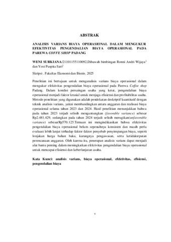 Sukriana, Weni (2025) ANALISIS VARIANS BIAYA OPERASIONAL DALAM MENGUKUR EFEKTIVITAS PENGENDALIAN BIAYA OPERASIONAL PADA PAREWA COFFE SHOP PADANG. Sarjana thesis, Universitas Putra Indonesia YPTK Padang.