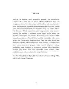 Penelitian ini bertujuan untuk menganalisis pengaruh Thin Capitalization, Kompensasi Rugi Fiskal dan Sales Growth terhadap Penghindaran Pajak, serta menguji peran Ukuran Perusahaan sebagai variabel moderasi pada perusahaan sektor energy yang terdaftar di Bursa Efek Indonesia selama periode 2020-2024. Populasi dalam penelitian ini adalah seluruh perusahaan sektor energi yang terdaftar di Bursa Efek Indonesia. Teknik pengambilan sampel yang digunakan adalah purposive sampling, dan diperoleh 23 perusahaan sebagai sampel. Metode analisis yang digunakan adalah regresi data panel dan Moderated Regression Analysis (MRA) dengan bantuan software EViews 12. Hasil penelitian menunjukkan bahwa secara parsial, Thin Capitalization, Kompensasi Rugi Fiskal, dan Sales Growth tidak berpengaruh signifikan terhadap penghindaran pajak. Selain itu, Ukuran Perusahaan tidak mampu memoderasi pengaruh ketiga variabel independen terhadap penghindaran pajak. Penelitian ini memberikan gambaran bahwa faktor-faktor keuangan yang diteliti belum dapat menjelaskan secara signifikan praktik penghindaran pajak pada perusahaan sektor energi di Indonesia. Kata Kunci: Penghindaran Pajak, Thin Capitalization, Kompensasi Rugi Fiskal, Sales Growth, Ukuran Perusahaan.
