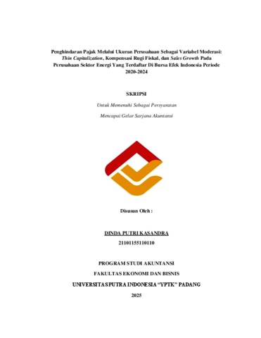 Kasandra, Dinda Putri (2025) Penghindaran Pajak Melalui Ukuran Perusahaan Sebagai Variabel Moderasi: Thin Capitalization, Kompensasi Rugi Fiskal, dan Sales Growth Pada Perusahaan Sektor Energi Yang Terdaftar Di Bursa Efek Indonesia Periode 2020-2024. Sarjana thesis, Universitas Putra Indonesia YPTK Padang.