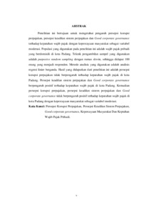 Penelitian ini bertujuan untuk mengetahui pengaruh persepsi korupsi perpajakan, persepsi keadilan sistem perpajakan dan Good corporate governance terhadap kepatuhan wajib pajak dengan kepercayaan masyarakat sebagai variabel moderasi. Populasi yang digunakan pada penelitian ini adalah wajib pajak pribadi yang berdomisili di kota Padang. Teknik pengambilan sampel yang digunakan adalah purposive random sampling dengan rumus slovin, sehingga didapat 100 orang yang menjadi responden. Metode analisis yang digunakan adalah analisis regresi linier berganda. Hasil yang didapatkan dari penelitian ini adalah persepsi korupsi perpajakan tidak berpengaruh terhadap kepatuhan wajib pajak di kota Padang. Persepsi keadilan sistem perpajakan dan Good corporate governance berpengaruh positif terhadap kepatuhan wajib pajak di kota Padang. Kemudian persepsi korupsi perpajakan, persepsi keadilan sistem perpajakan dan Good corporate governance tidak berpengaruh positif terhadap kepatuhan wajib pajak di kota Padang dengan kepercayaan masyarakat sebagai variabel moderasi. Kata Kunci: Persepsi Korupsi Perpajakan, Persepsi Keadilan Sistem Perpajakan, Good corporate governance, Kepercayaan Masyarakat Dan Keptuhan Wajib Pajak Pribadi.