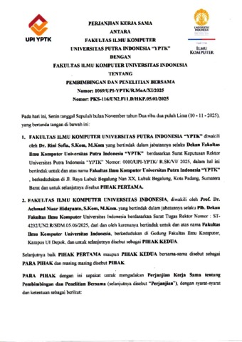 Biro, Kerjasama (2025) PERJANJIAN KERJA SАМА ANTARA FAKULTAS ILMU KOMPUTER UNIVERSITAS PUTRA INDONESIA “YРТК" DENGAN FAKULTAS ILMU KOMPUTER UNIVERSITAS INDONESIA TENTANG PEMBIMBINGAN DAN PENELITIAN BERSAMA. Biro Kerjasama UPI YPTK. (Unpublished)