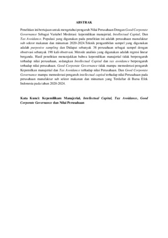 Penelitian ini bertujuan untuk mengetahui pengaruh Nilai Perusahaan Dengan Good Corporate Governance Sebagai Variabel Moderasi: kepemilikan manajerial, Intellectual Capital, Dan Tax Avoidance. Populasi yang digunakan pada penelitian ini adalah perusahaan manufaktur sub sektor makanan dan minuman 2020-2024.Teknik pengambilan sampel yang digunakan adalah purposive sampling dan Didapat sebanyak 38 perusahaan sebagai sampel dengan observasi sebanyak 190 kali observasi. Metode analisis yang digunakan adalah regresi linear berganda. Hasil penelitian menunjukkan bahwa kepemilikan manajerial tidak berpengaruh terhadap nilai perusahaan, sedangkan Intellectual Capital dan tax avoidance berpengaruh terhadap nilai perusahaan. Good Corporate Governance tidak mampu memoderasi pengaruh Kepemilkan manajerial dan Tax Avoidance terhadap nilai Perusahaan. Dan Good Corporate Governance mampu memoderasi pengaruh intellectual capital terhadap nilai Perusahaan pada perusahaan manufaktur sub sektor makanan dan minuman yang Terdaftar di Bursa Efek Indonesia pada tahun 2020-2024. Kata Kunci: Kepemilikam Manajerial, Intellectual Capital, Tax Avoidance, Good Corporate Governance dan Nilai Perusahaana