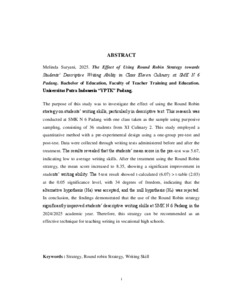 Suryani, Melinda (2025) THE EFFECT OF USING ROUND ROBIN STRATEGY TOWARD STUDENTS' DESCRIPTIVE WRITING ABILITY IN CLASS ELEVEN CULINARY AT SMKN 6 PADANG IN ACADEMIC YEAR 2024/2025. Sarjana thesis, Universitas Putra Indonesia YPTK Padang.