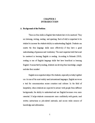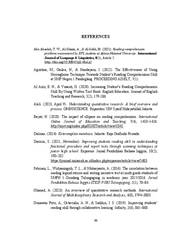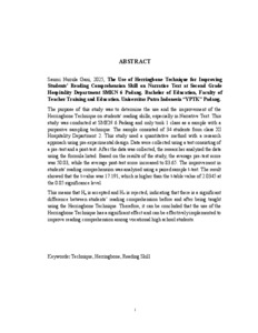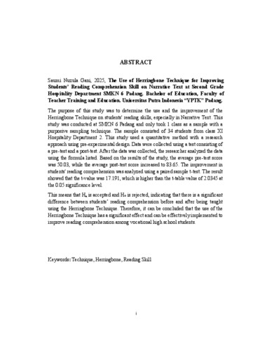 Gani, Saumi Nuzula (2025) THE USE OF HERRINGBONE TECHNIQUE FOR IMPROVING STUDENTS’ READING COMPREHENSION SKILL ON NARRATIVE TEXT AT SECOND GRADE HOSPITALITY DEPARTMENT SMKN 6 PADANG. Sarjana thesis, Universitas Putra Indonesia YPTK Padang.