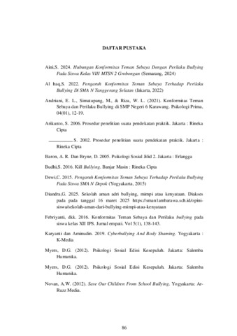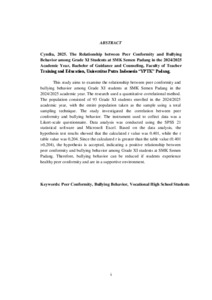Meltani, Cindi (2025) HUBUNGAN KONFORMITAS TEMAN SEBAYA DENGAN PERILAKU BULLYING PADA PESERTA DIDIK KELAS XI DI SMK SEMEN PADANG TAHUN AJARAN 2024/2025. Sarjana thesis, Universitas Putra Indonesia YPTK Padang.