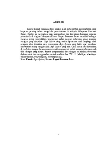 Kantor Bupati Pasaman Barat adalah salah satu institusi pemerintahan yang berperan penting dalam mengelola pemerintahan di wilayah Kabupaten Pasaman Barat,. Kantor ini merupakan pusat administrasi dan koordinasi berbagai kegiatan pemerintah di tingkat kabupaten.Kantor Bupati Pasaman Barat memiliki berbagai ruangan sering menyulitkan pengunjung untuk mencari informasi lokasi maupun ruangan yang ditujunya. Sign System yang sudah digunakan tidak lengkap, tidak seragam atau konsisten dan penempatan Sign System yang tidak tepat membuat masyarakat sering mengabaikan Sign System yang ada. Oleh karena itu dibutuhkan Sign System dengan tujuan mempermudah masyarakat untuk mencari informasi arah dan ruangan yang dituju. Proses pengumpulan data dengan melakukan observasi, dokumentasi, dan menggunakan metode analisis data 5W+1H (what/apa, who/siapa, where/dimana, why/mengapa, how/bagaimana). Kata Kunci : Sign System, Kantor Bupati Pasaman Barat