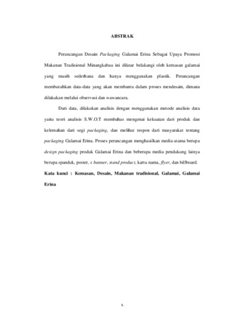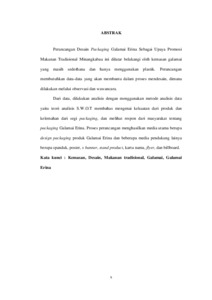 Perancangan Desain Packaging Galamai Erina Sebagai Upaya Promosi Makanan Tradisional Minangkabau ini dilatar belakangi oleh kemasan galamai yang masih sederhana dan hanya menggunakan plastik. Perancangan membutuhkan data-data yang akan membantu dalam proses mendesain, dimana dilakukan melalui observasi dan wawancara.Dari data, dilakukan analisis dengan menggunakan metode analisis data yaitu teori analisis S.W.O.T membahas mengenai kekuatan dari produk dan kelemahan dari segi packaging, dan melihat respon dari masyarakat tentang packaging Galamai Erina. Proses perancangan menghasilkan media utama berupa design packaging produk Galamai Erina dan beberapa media pendukung lainya berupa spanduk, poster, x banner, stand product, kartu nama, flyer, dan billboard. Kata kunci : Kemasan, Desain, Makanan tradisional, Galamai, Galamai Erina